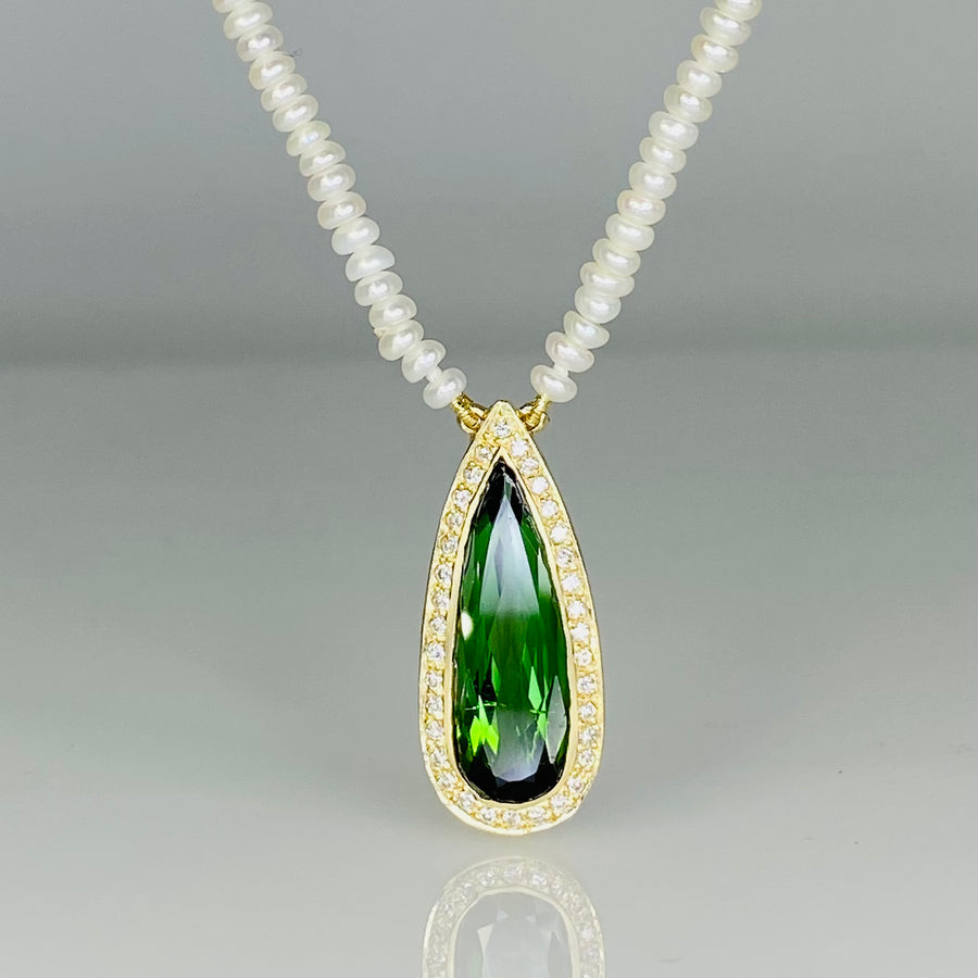 This beautiful, one-of-a-kind necklace features a tear drop green tourmaline set in 14K yellow gold, surrounded by a diamond halo. The pendant hangs on a freshwater pearl chain that can be adjusted between 16 and 18 inches. The pendant measures 11x26mm. The green tourmaline is 4.34 carats, and the diamonds weigh 0.20ct in total. This timeless necklace would be the perfect addition to any necklace stack or can be worn alone to showcase its beauty.