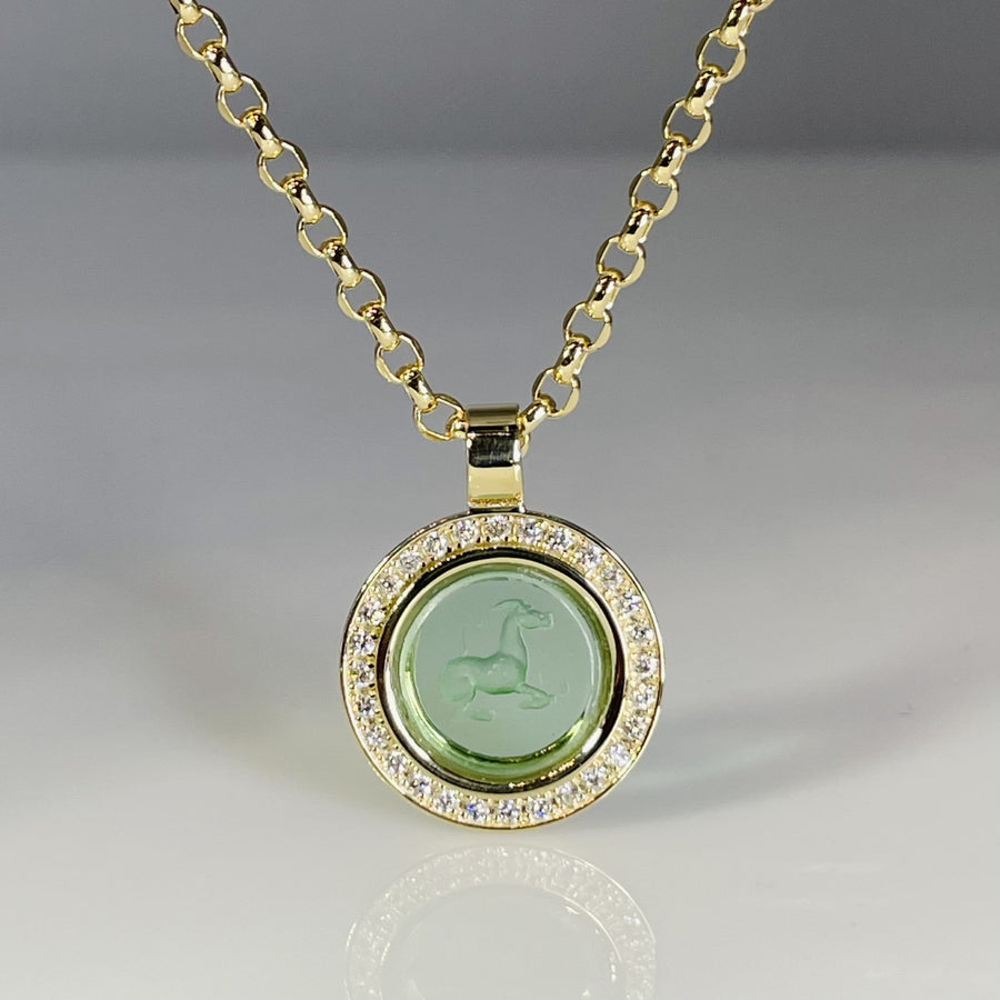 This beautiful necklace features an Italian intaglio glass, inside a Capricorn symbol, bezel set in 14K yellow gold surrounded by a white diamond halo. The pendant measures 17mm and hangs on an 18-inch link chain. The diamonds weigh 0.27 carats in total. This necklace is perfect for the zodiac lover in your life, or anyone you may know whos' zodiac is a Capricorn.